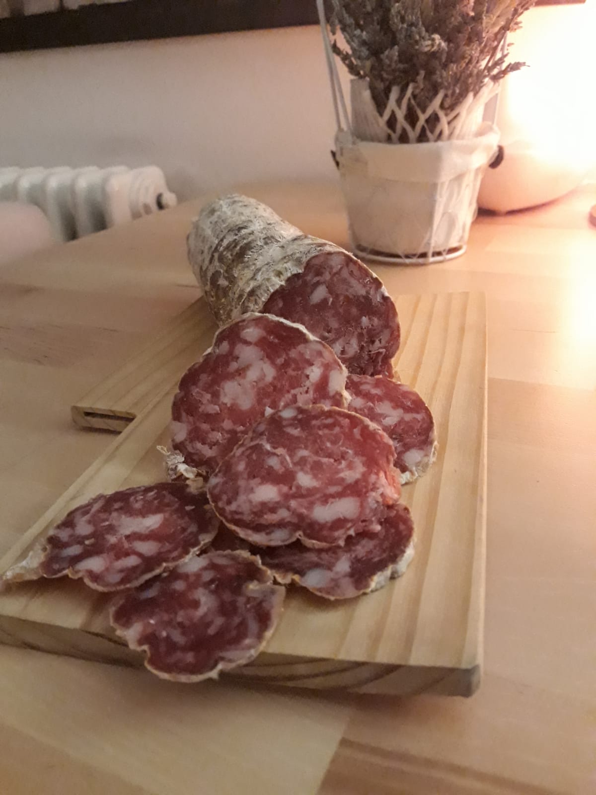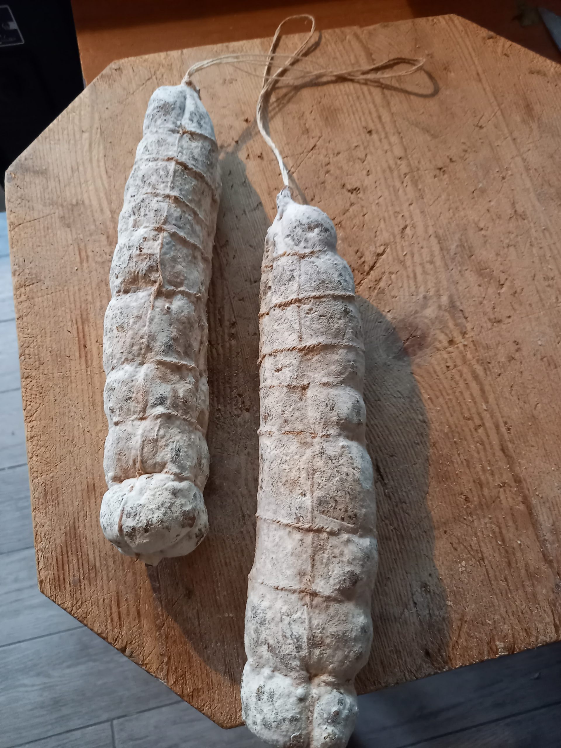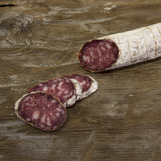 Lavorazione artigianale stagionatura media. Salami da circa 500/600 gr l’uno.